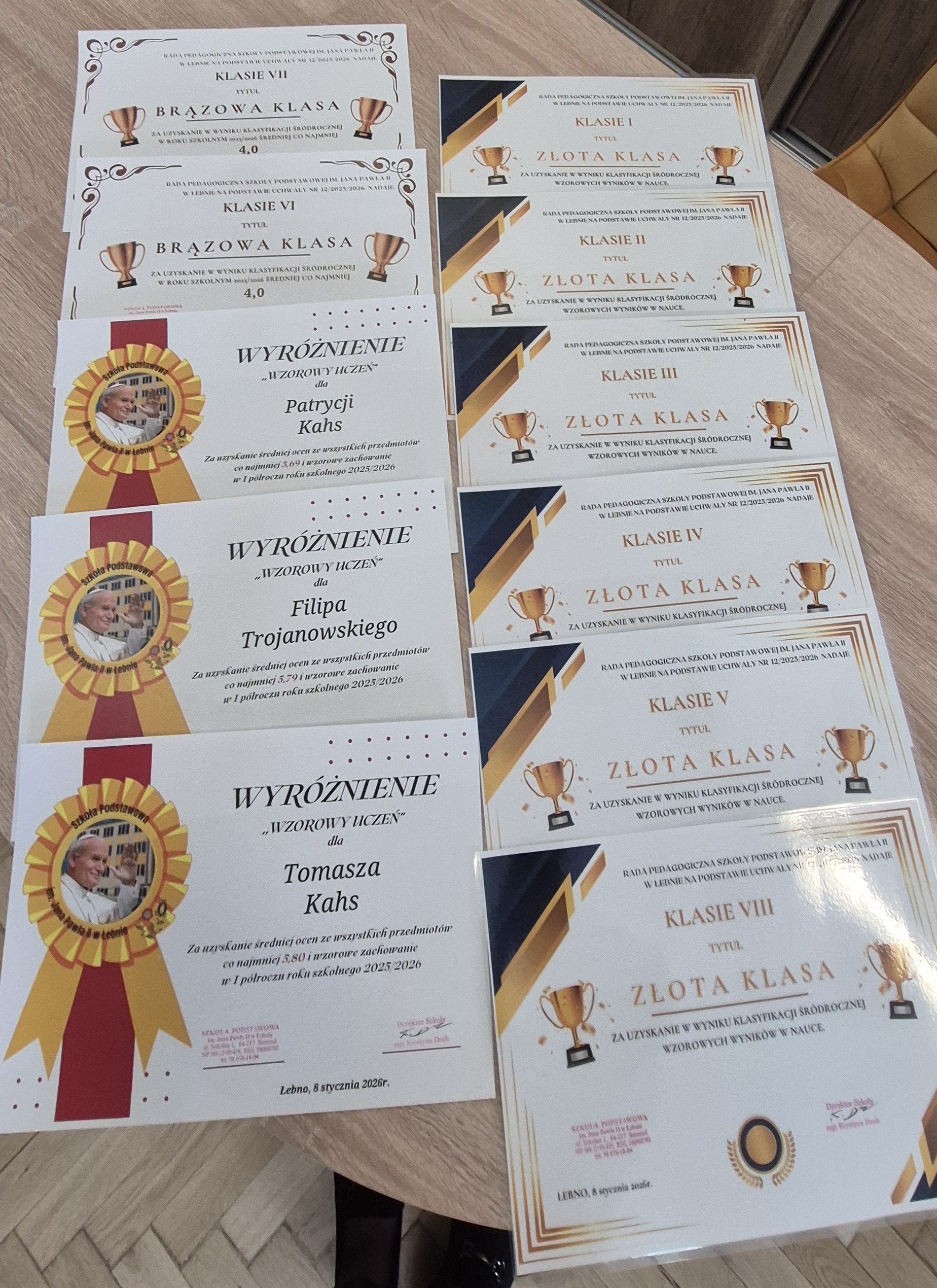 Rada Pedagogiczna Szkoły Podstawowej im. Jana Pawła II w Łebnie na podstawie Uchwały nadała klasom wyróżniającym się w wyniku klasyfikacji śródrocznej tytuł: „Złota Klasa” – za uzyskanie średniej co najmniej 4,75 oraz tytuł: „Brązowa Klasa” – za uzyskanie średniej co najmniej 4,0.