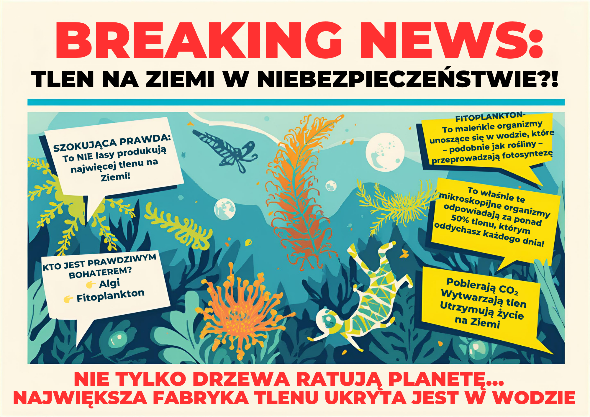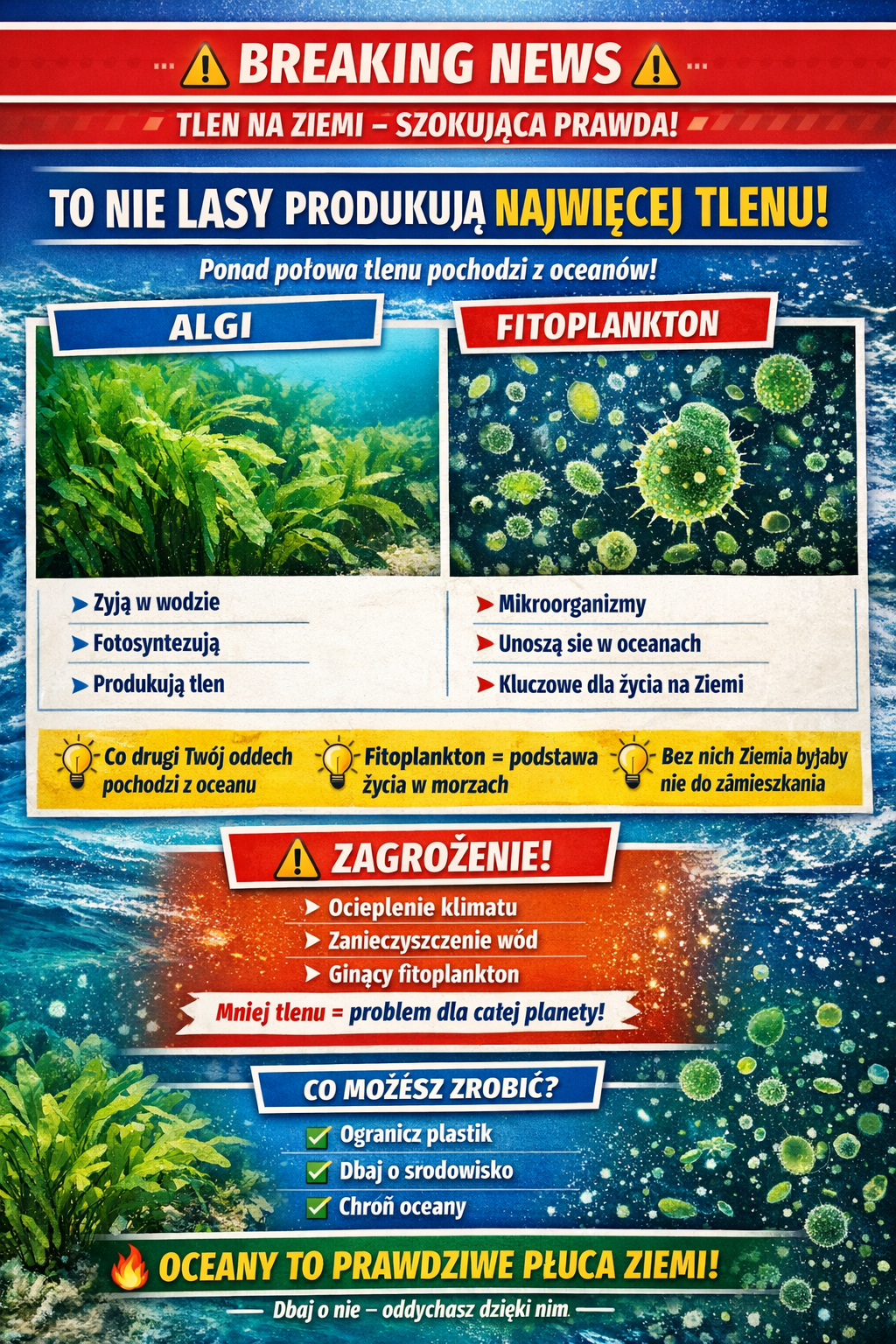 Tym razem nasi uczniowie przygotowali ulotki (z pomocą AI) dotyczące alg oraz fitoplanktonów.