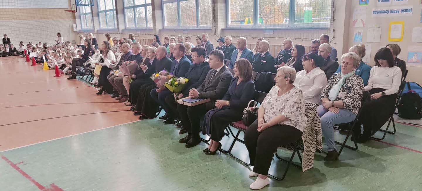 Następnie w sali gimnastycznej odbyła się część oficjalna, w której uczestniczyli zaproszeni goście: przedstawiciele władz samorządowych, dyrektorzy zaprzyjaźnionych placówek, emerytowani nauczyciele i pracownicy oraz uczniowie.