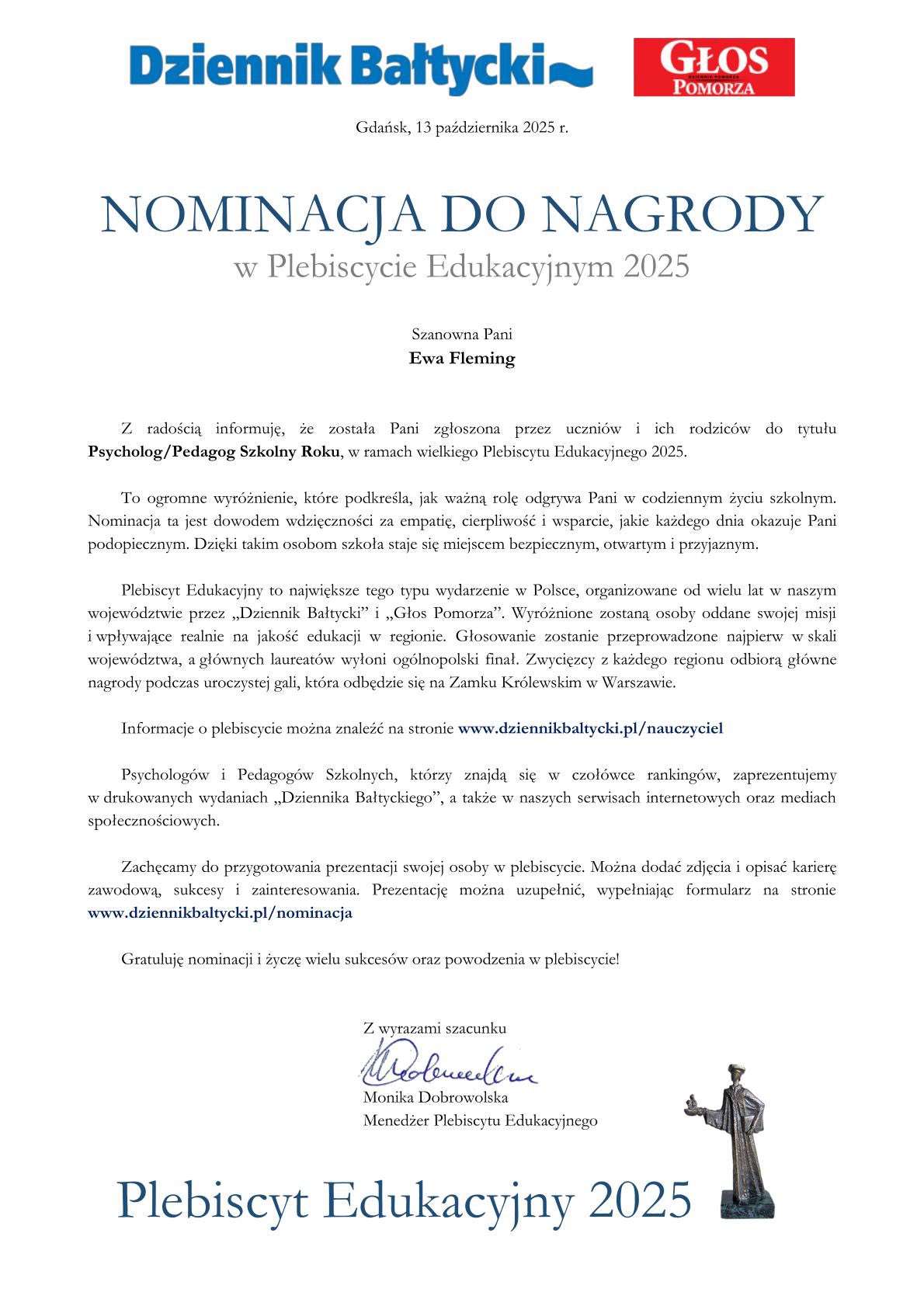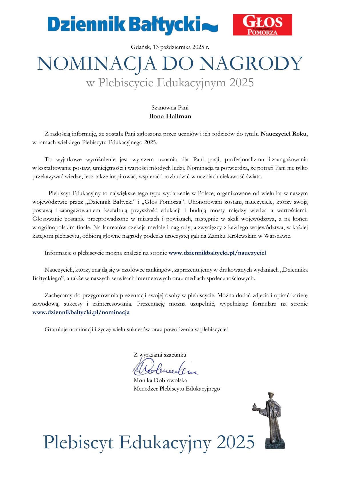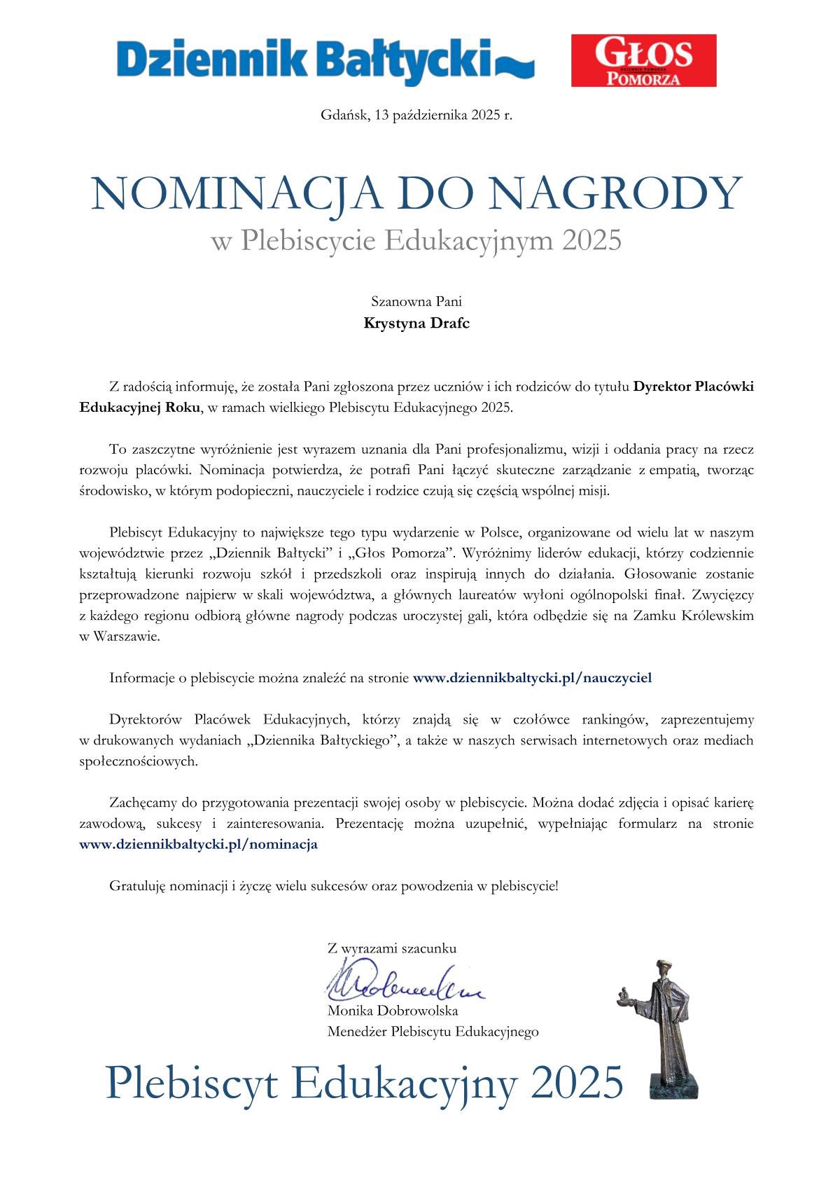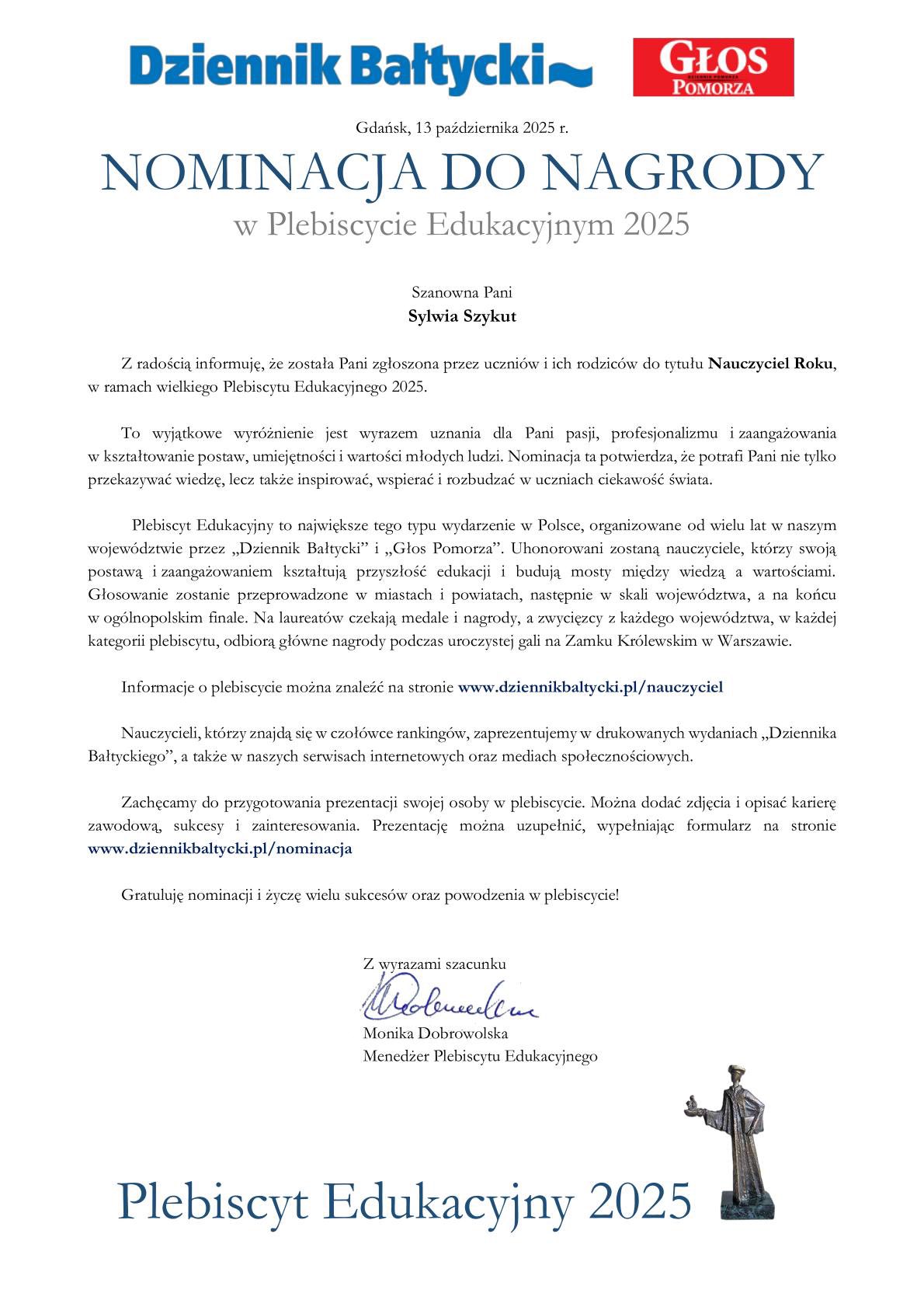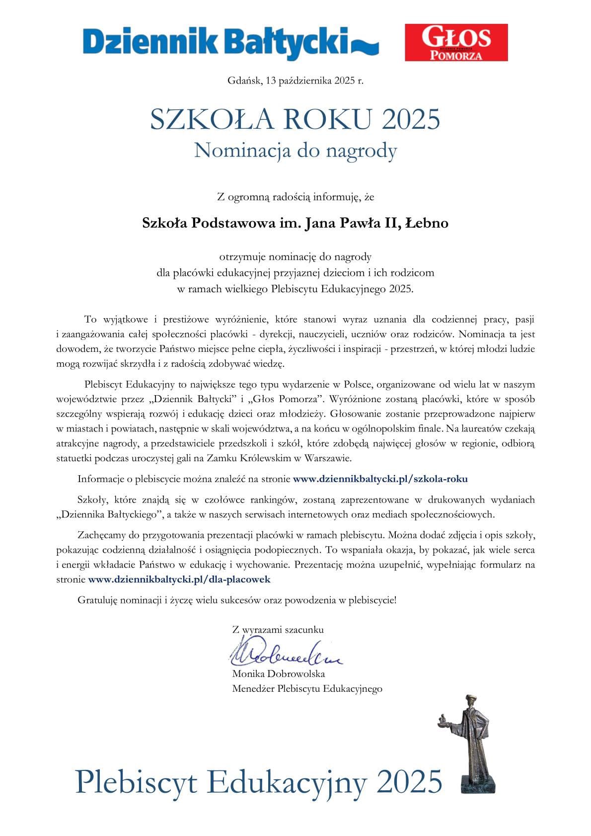 Nasza szkoła została nominowana do tytułu Szkoła Roku w Plebiscycie Edukacyjnym 2025 organizowanym przez